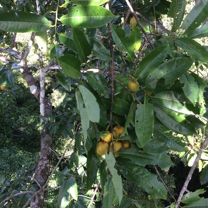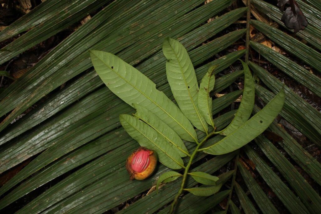 Une autre espèce aux fruits identiques mais plus petits est également présente le long des sentiers, c’est le Virola michelii.