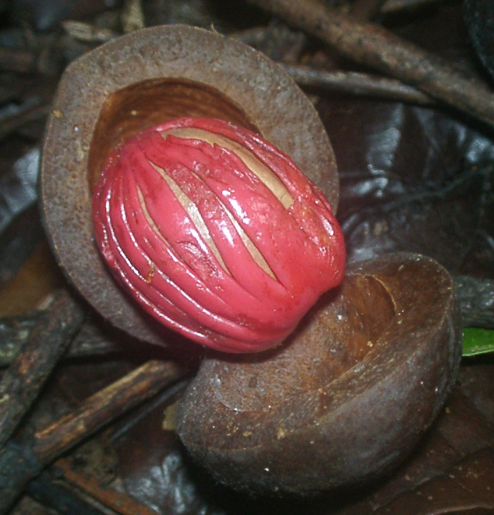 C’est à la saison des fruits (comprise principalement entre octobre et février sur la réserve Trésor) qu’ils se font le plus remarquer. La graine ressemble à une noix de muscade (les virolas étant également de la famille des myristicacées) recouverte d’un arille rouge vif en lamelles espacées se rejoignant à chaque extrémité. Une coque bivalve, ronde, la renferme.