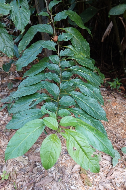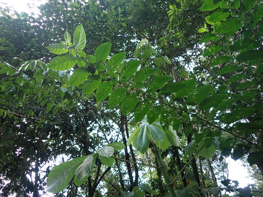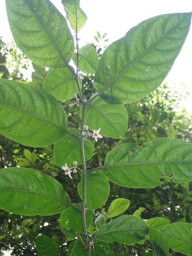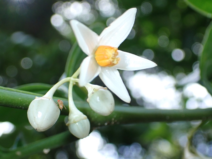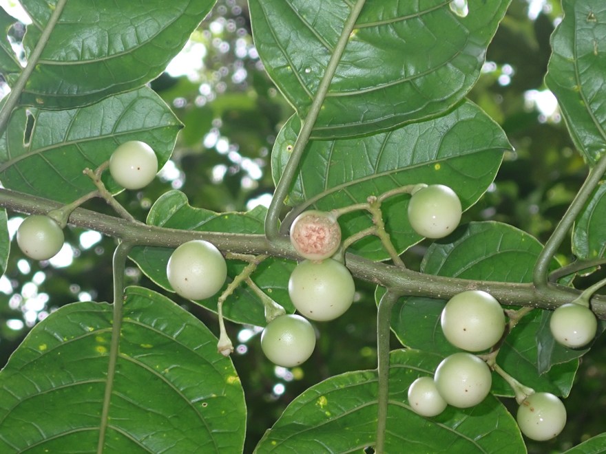 Cet arbuste de la famille des solanacées (même famille que la tomate) est très commun sur toute la bordure routière de la réserve Trésor. Il atteint les trois mètres de haut et pousse facilement dans les zones secondarisées. Il est aisément reconnaissable lorsqu’apparaissent ses fleurs en étoiles blanches au cœur rouge puis ses fruits globuleux verts blanchâtres. En leur absence, un autre détail anatomique est facile à observer : la plante est anisophylle, ce qui veut dire qu’elle présente des feuilles de tailles différentes. Pour Solanum leucocarpon, celles-ci sont associées par deux du même côté du rameau, l’une est grande et l’autre petite (environ 3 fois moins grande). Elles sont par ailleurs opposées, donnant au feuillage un aspect très particulier.
