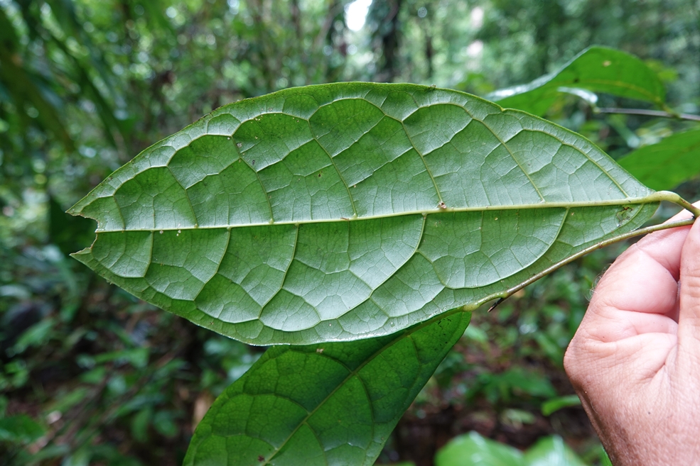 Les feuilles du Quararibea duckei sont aussi caractéristiques, assez grandes, un peu rigides et gaufrées, elles présentent sous la face inférieure à l’aisselle des nervures des acarodomaties. Ces micro-loges hébergent des acariens, spécialement aménagées par la plante, laquelle sécrète en plus un liquide qui nourrit son hôte. En échange de ces bons procédés, les acariens protègent leur plante hôte des attaques de parasites ou de champignons dont ils se nourrissent également.