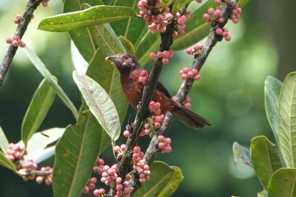 Vivant en petit groupe d’une demi-douzaine d’individus, on remarque dans son comportement que le bèk darjan – son nom en créole – s’est adapté à la présence de l’homme, puisque cet oiseau est peu craintif.