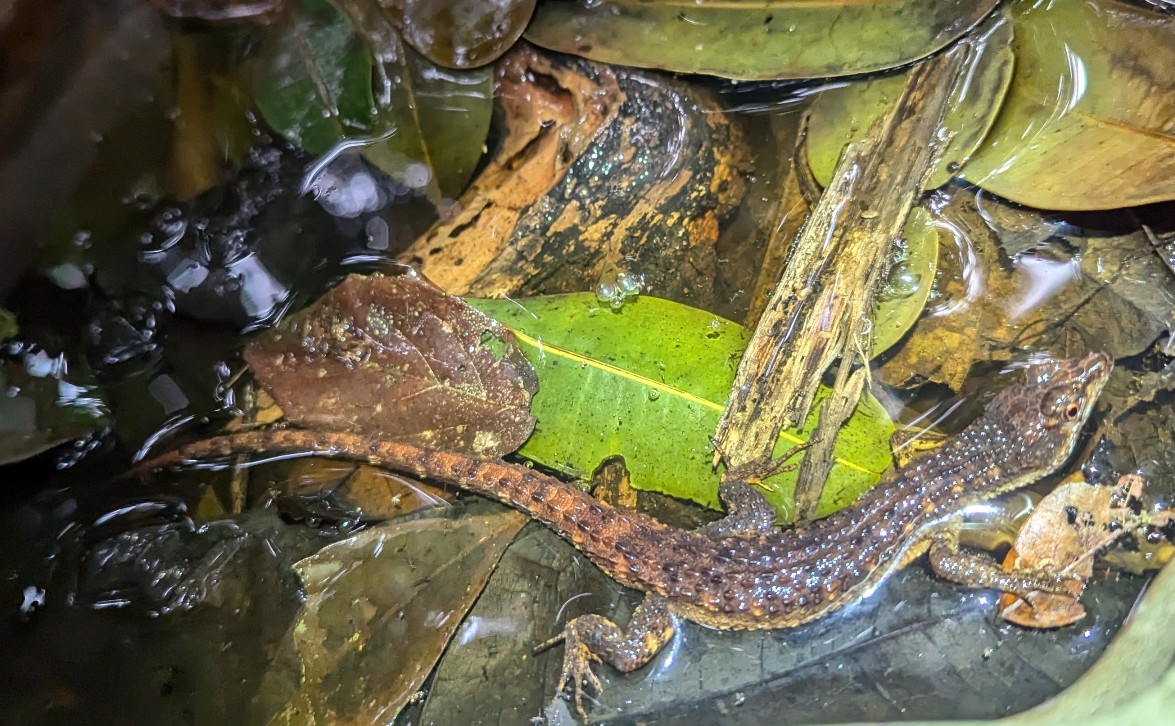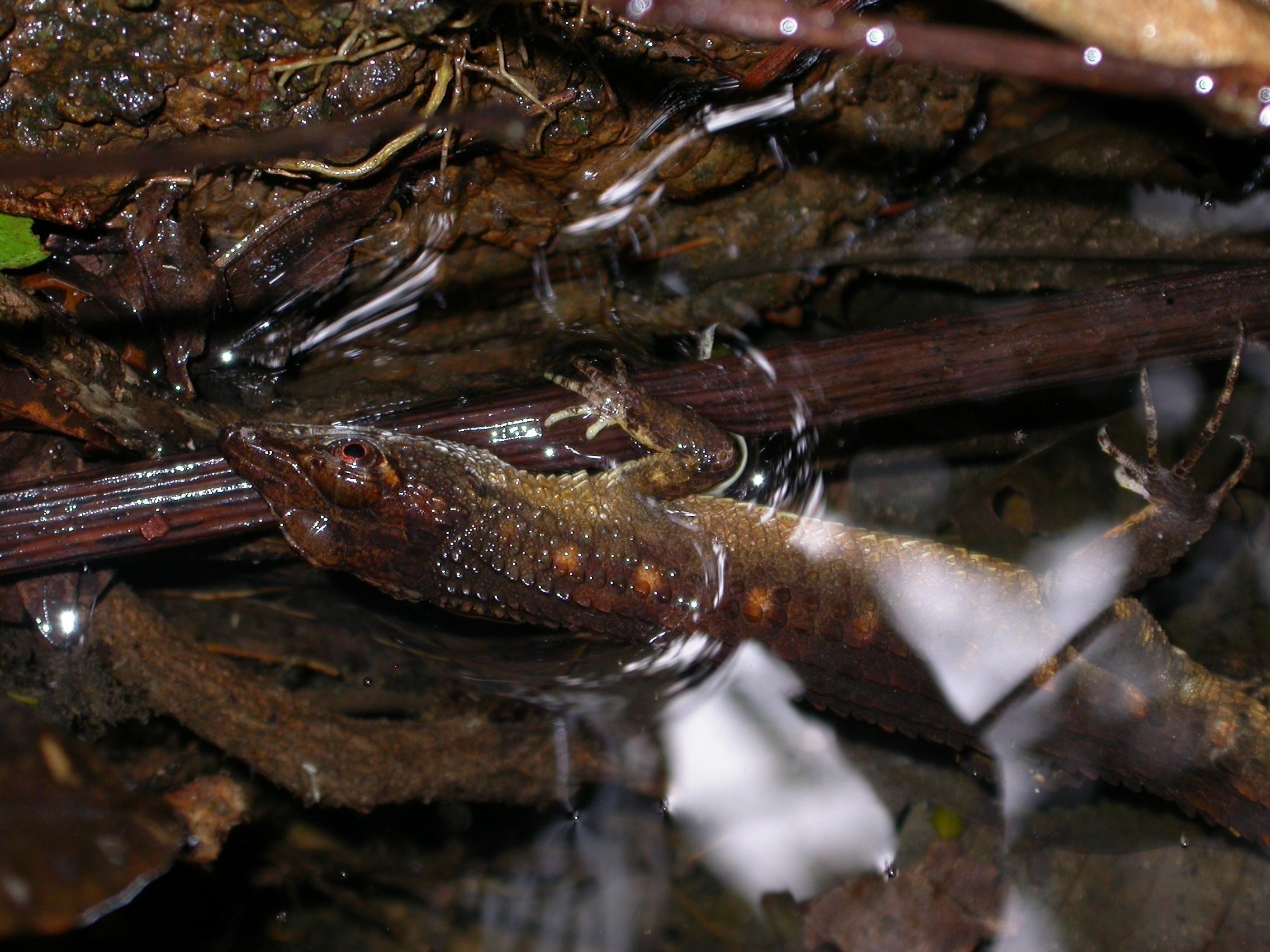 Espèce de la famille des Gymnophthalmidae, le Neusticure du Suriname est un lézard caïman : il est surnommé ainsi du fait de son aspect général faisant penser à ces grands reptiles. Sa couleur marron sombre le rend discret dans les habitats aquatiques qu’il fréquente, qui peuvent être des renfoncements dans les arbres, le lit d’un cours d’eau rocheux ou encore des micro-vasques rocheuses. Semi-aquatique, il chasse des alevins de poissons et des insectes. Sa taille va jusqu’à 9,5 mm de la tête et du corps (cette distance correspond à la LMC : longueur maximale du museau au cloaque, ce dernier étant situé entre les pattes arrière de l’animal). Sa queue est aplatie, par rapport à son corps qui est plutôt cylindrique. Une distinction est à noter : le Neusticure du Suriname a des points blancs sur les lèvres. Il possède des écailles dorsales en relief au niveau de la nuque, tronc et base de la queue ; c’est pour cette raison qu’il était auparavant appelé « Neusticure rugueux ». Une confusion est possible avec le Neusticure sillonné (Neusticurus bicarinatus), qui lui est plutôt jaune-brun, avec des tâches jaunes sur les flancs.