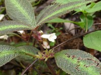 Avec son feuillage panaché, cette petite plante de sous-bois commune des sentiers de la réserve ne passe pas inaperçue. Particulièrement abondante sur l’ancienne piste du placer Trésor, cette Gesneriacée forme des tapis compacts s’élevant à quelques centimètres du sol et présentant, au cœur de la saison des pluies, ses fleurs blanches tubulaires.